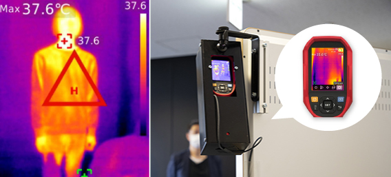 本製品は±0.1℃の誤差で計測が可能となる高精度サーマルカメラを搭載し、約0.5秒で瞬時スクリーニングを行います。設定温度(初期設定値では37.5℃)を上回る場合はアラーム音と画面表示で警告を行い、自発的な注意喚起を促します。
